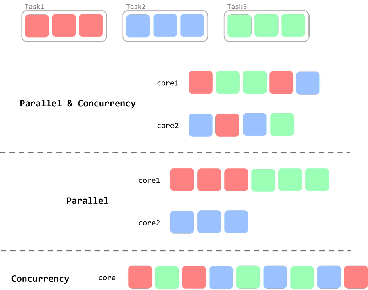 | 동작 방식 | 싱글 코어에서 멀티 쓰레드(Multi thread)를 동작 시키는 방식 | 멀티 코어에서 멀티 쓰레드(Multi thread)를 동작시키는 방식 |