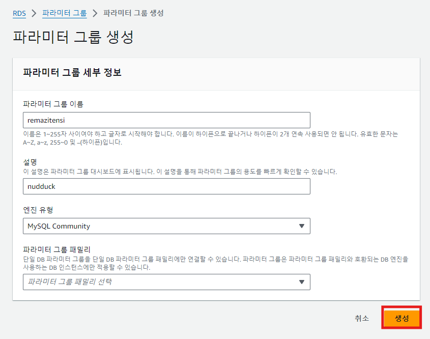 아래 메뉴 중 "파라미터 그룹" 을 누르고 "파라미터 그룹 생성" 버튼을 누른다.