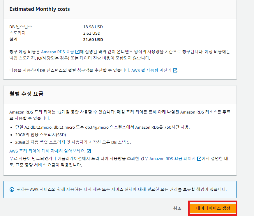 이전에는 t2.micro만 프리티어에서 사용이 가능했지만 현재는 db.t3.micro와 db.t4g.micro도 프리티어에서 사용할 수 있습니다.