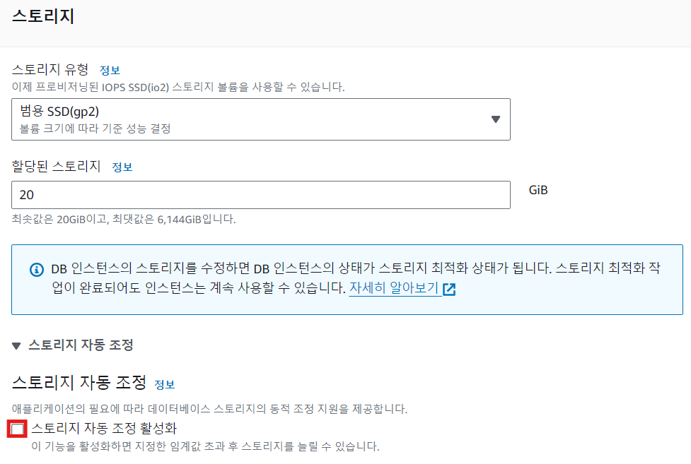 프리티어 최대 사용량이 20GiB이므로 20GiB으로 변경 해주어야 과금될 요소를 차단할 수 있습니다. 그리고 스토리지 자동 조정 활성화 체크를 해제해하여 스토리지가 자동으로 늘어나지 않도록 설정해줍니다.