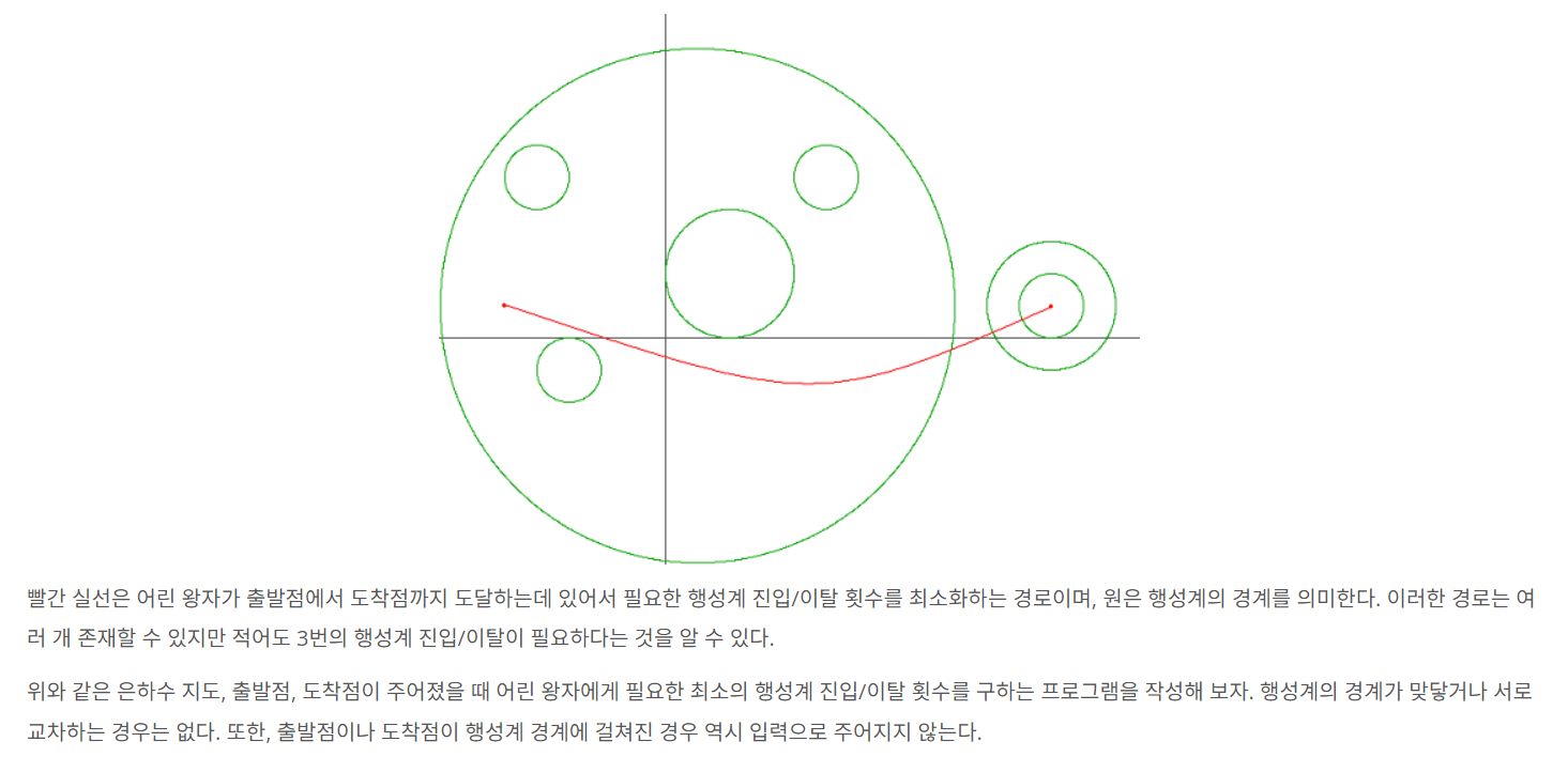 - 행성계와의 관계 확인: 각 행성계의 반지름 제곱과 비교하여 출발점과 도착점 중 적어도 하나가 행성계의 내부에 있는지 확인합니다.