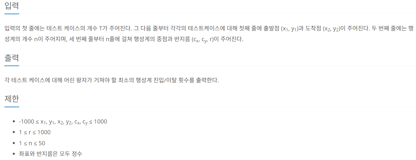 - 입력 받기: 테스트 케이스 개수와 각 테스트 케이스에 대해 출발점, 도착점, 행성계의 개수와 각 행성계의 정보(중심 좌표와 반지름)를 입력받습니다.